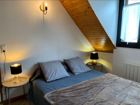 Une chambre avec lit en 160x200, tables et lampes de chevet, placard.